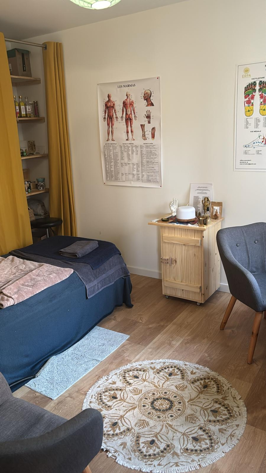 Dans son cabinet chez moi, ou à Paris. Il y a mon bureau, ma table de massage et mes huiles.
